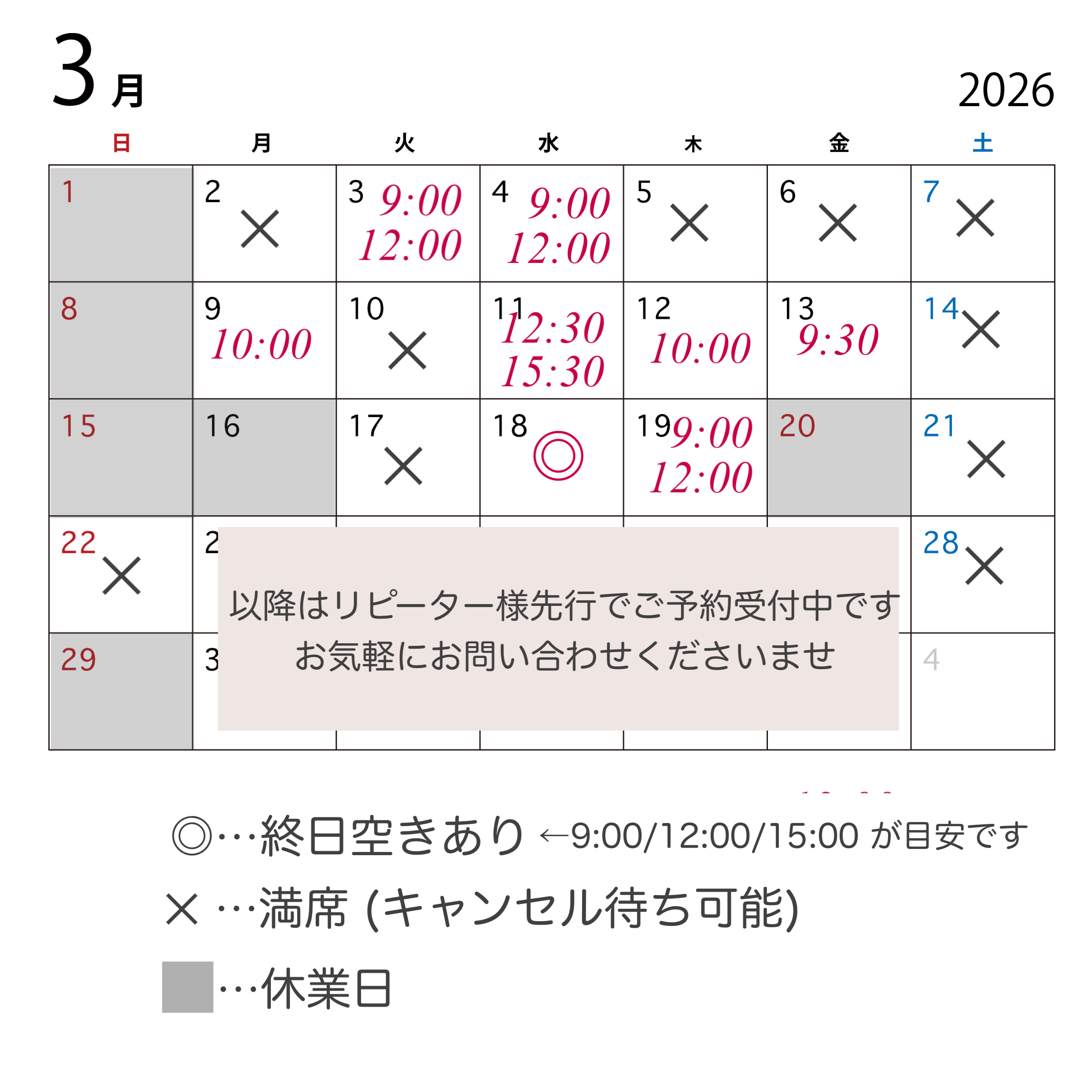 【随時更新】2月3月空き状況