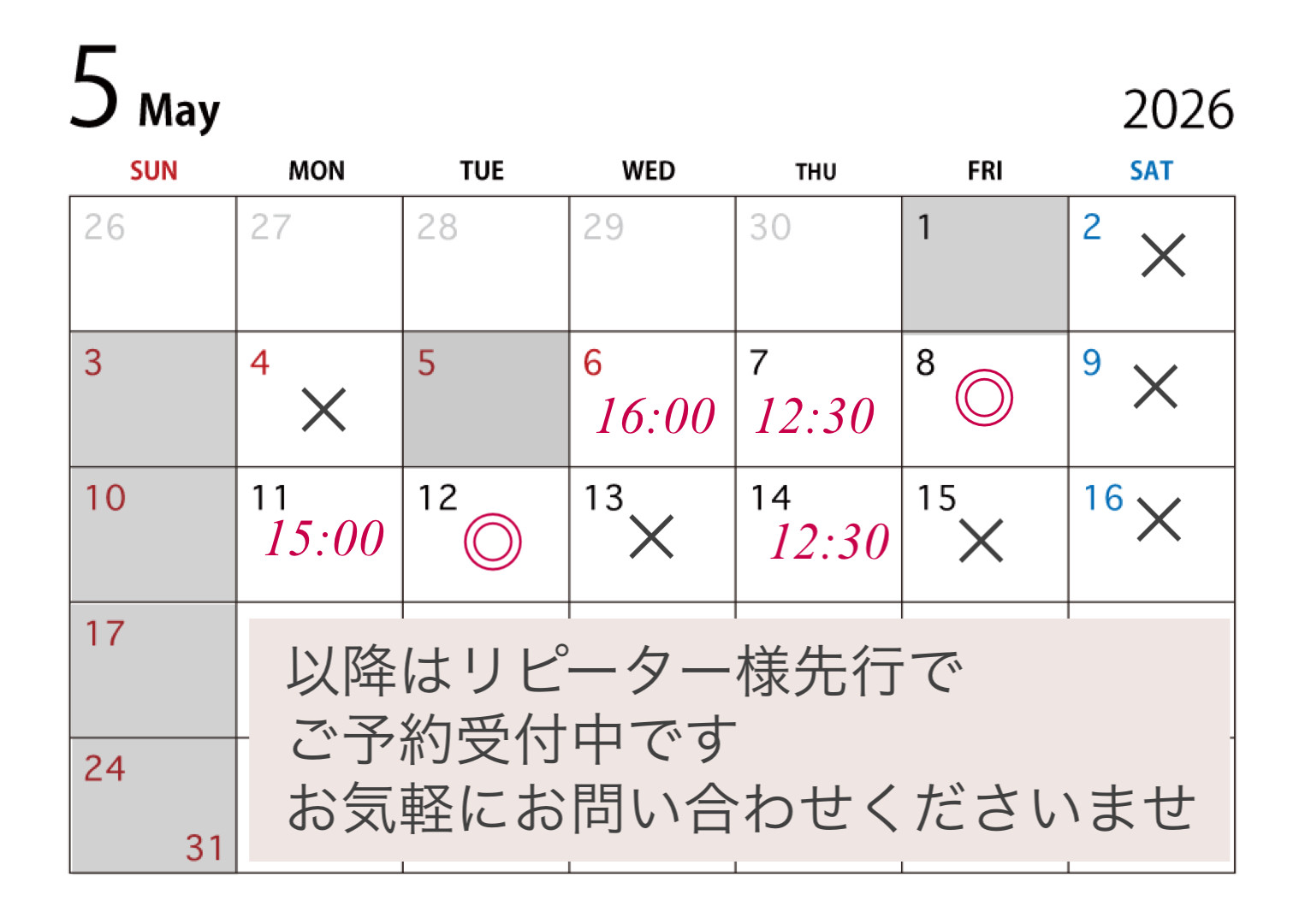 【随時更新】4月5月空き状況