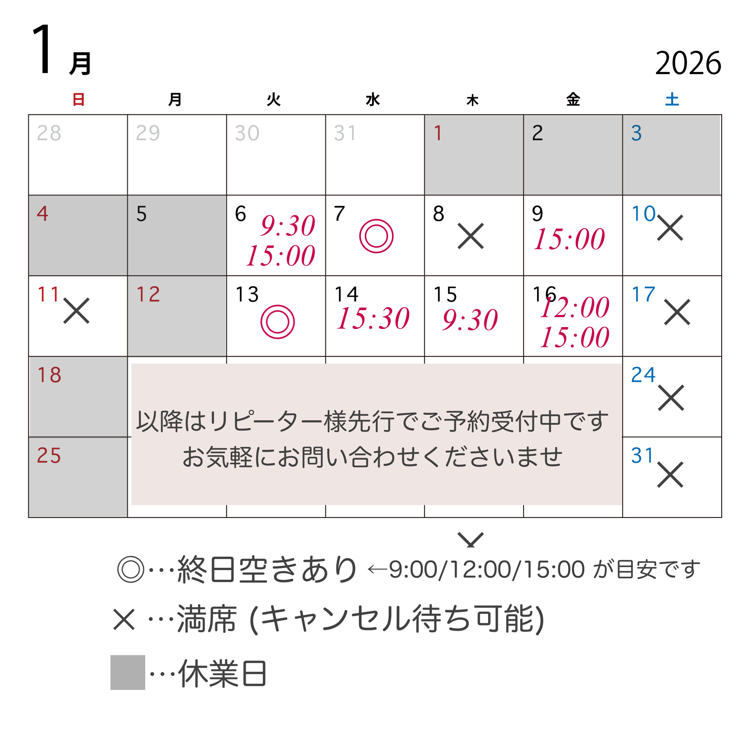 土曜日枠は常にリピーター様の次回予約で埋まっているため、現在ご予約の受付を停止しております。